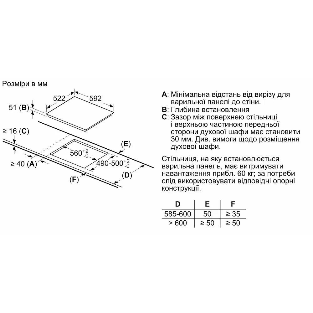 Розміри приладу (ВхШхГ мм): 51 x 592 x 522Необхідний розмір ніші для встановлення (ВхШхД мм): 51 x 560 x (490 - 500)