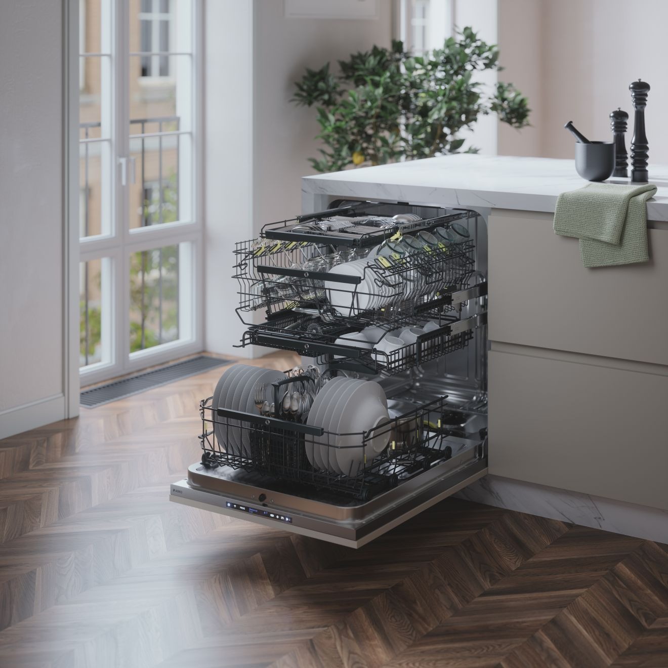 Полностью встроенная XXL посудомоечная машина, проверенная на 20 лет использования, с четырехуровневой системой Flexi Racks™, низким уровнем шума (38 дБ), Status Light™, Turbo Combi Drying™, Auto Dose, дверца с функцией push-to-open и возможностью подключения .
