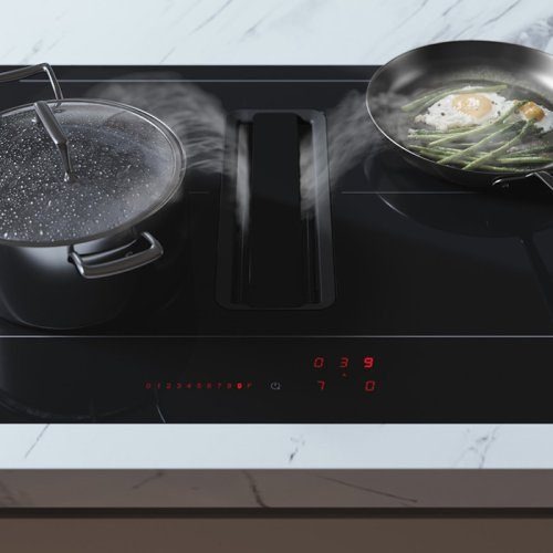 Эта варочная поверхность в глянцевом черном цвете обладает эффективной вытяжкой, которая удаляет дым и запахи даже во время интенсивного приготовления.