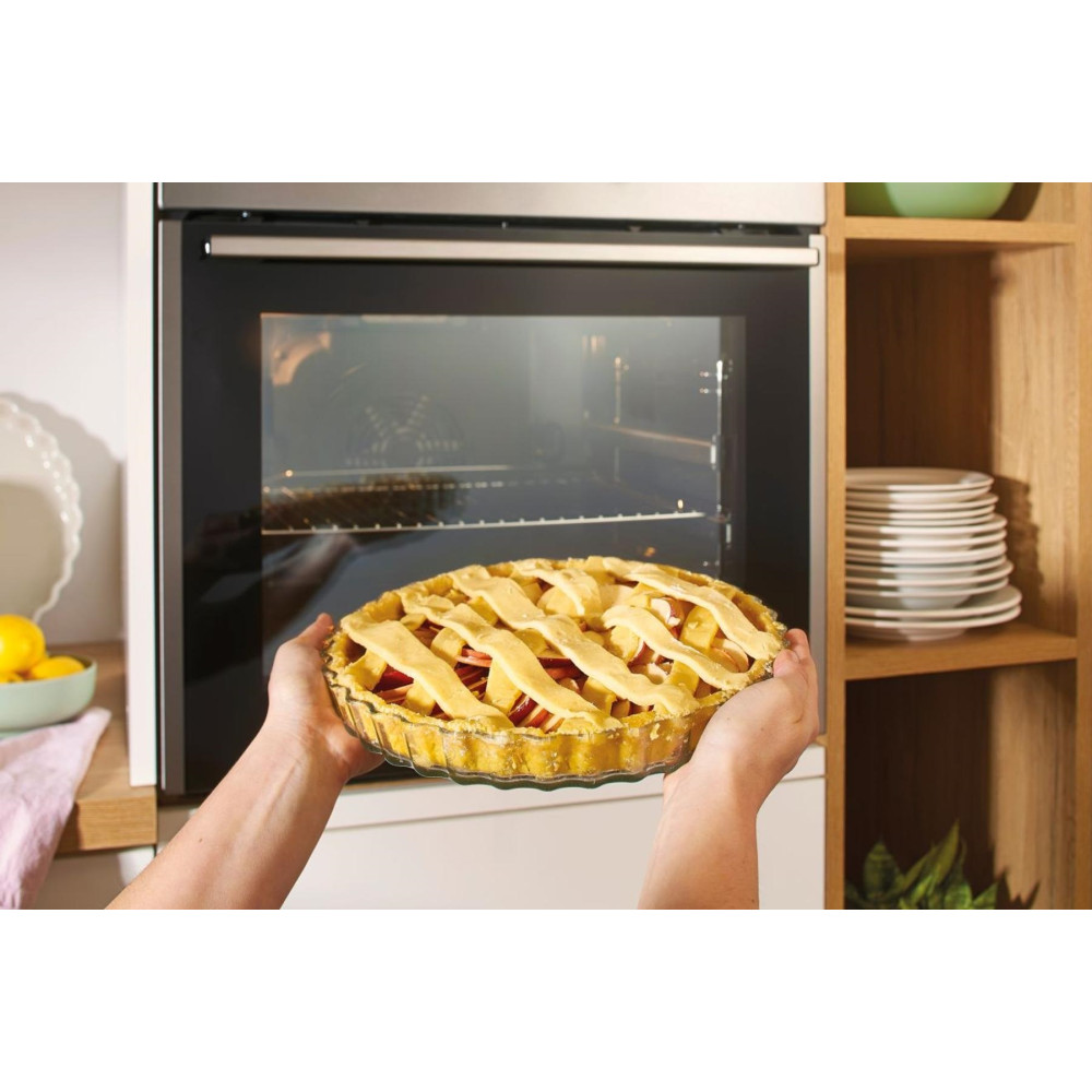 Духова шафа, яка тепер ще просторіша, має овальну форму, що створює ефект традиційної дров’яної печі. Це забезпечує оптимальну циркуляцію повітря, що, повністю огортаючи страву, робить її ніжною та соковитою всередині й неймовірно хрусткою зовні. У камері об’ємом 71 л із заглибленими боковими стінками повітря розподіляється ще краще. Завдяки цьому у всій духовій шафі підтримується однакова температура, що забезпечує рівномірне випікання страви. Спеціальний напрямок циркуляції повітря створює професійні умови приготування їжі на одному або одночасно на кількох рівнях духової шафи.