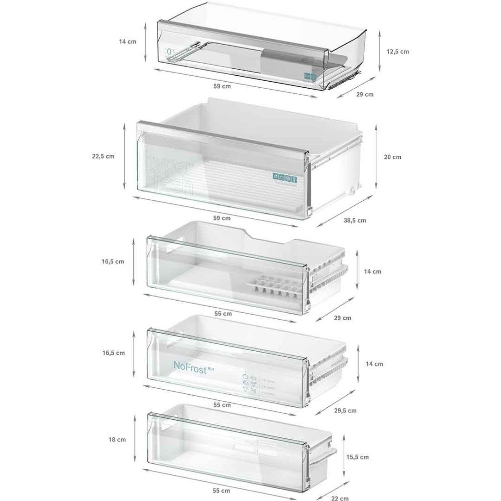 - bigBox (бігБокс), hyperFresh plus, noFrost (ноуФрост), varioZone (варіоЗона), Функція швидкого охолодження